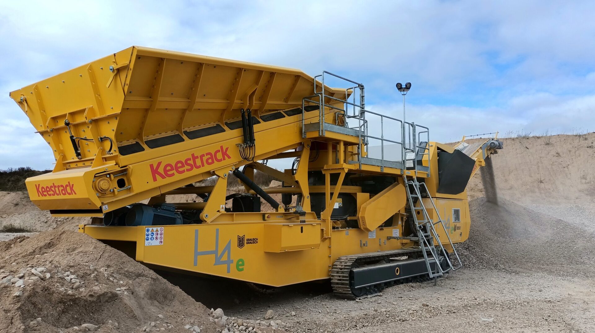Mobilna kruszarka stożkowa Keestrack H4e o masie 38 T. Zaprojektowana z myślą o kruszeniu najtwardszych skał i rud. Dostępna wyłącznie z napędem hybrydowym. Niezrównana wydajność i mobilność w szerokim zakresie zastosowań jak kruszenie wstępne, wtórne, trzeciorzędowe lub czwartorzędowe, większość zastosowań w kamieniołomach i górnictwie, granit i bazalt, żwir rzeczny i morski, produkcja kruszyw do asfaltu, betonu i innych.