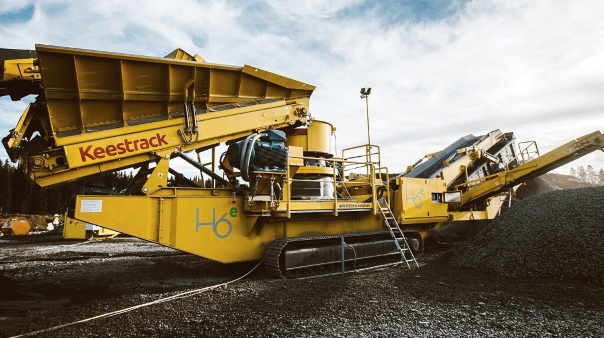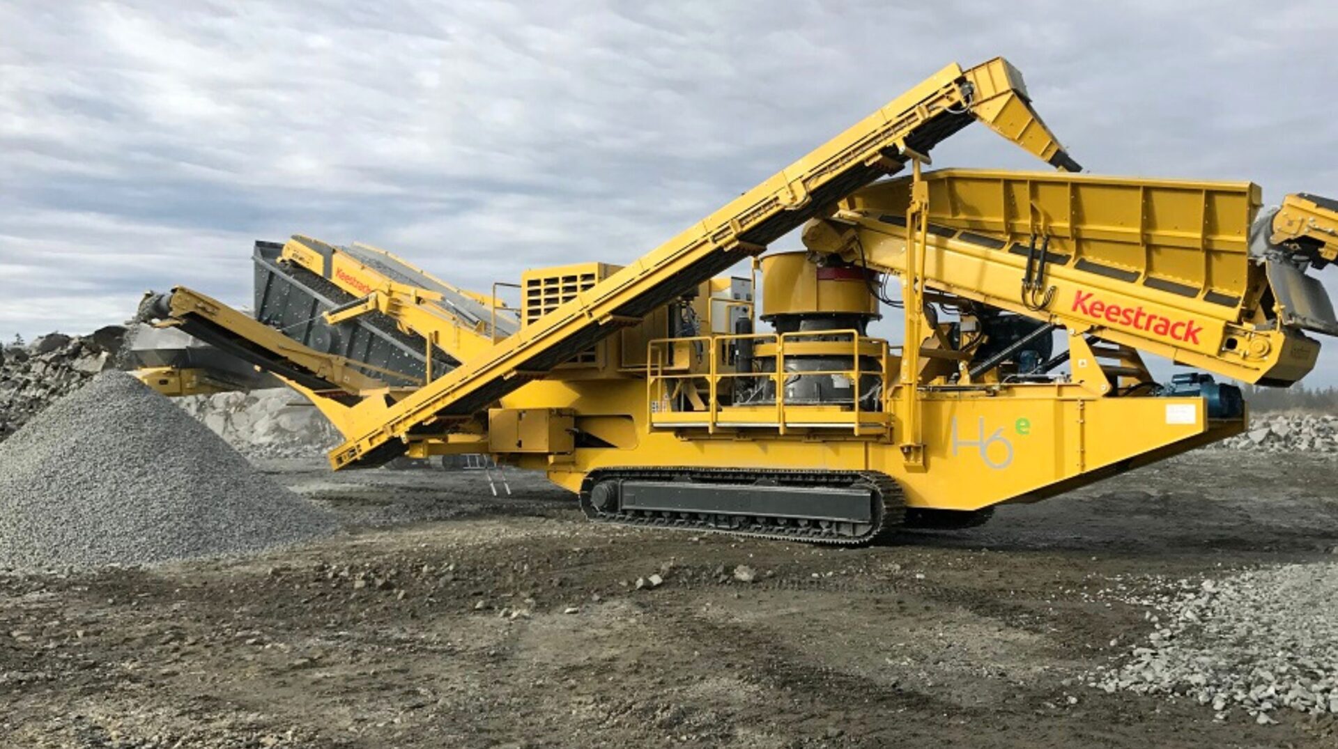 Mobilna kruszarka stożkowa Keestrack H6e o masie 51 T z możliwością zdemontowania komory silnika. Zaprojektowana z myślą o kruszeniu najtwardszych skał i rud. Dostępna wyłącznie z napędem hybrydowym. Niezrównana wydajność i mobilność w szerokim zakresie zastosowań jak kruszenie wstępne, wtórne, trzeciorzędowe lub czwartorzędowe, większość zastosowań w kamieniołomach i górnictwie, granit i bazalt, żwir rzeczny i morski, produkcja kruszyw do asfaltu, betonu i innych. Dostępna wyłącznie z napędem hybrydowym.
