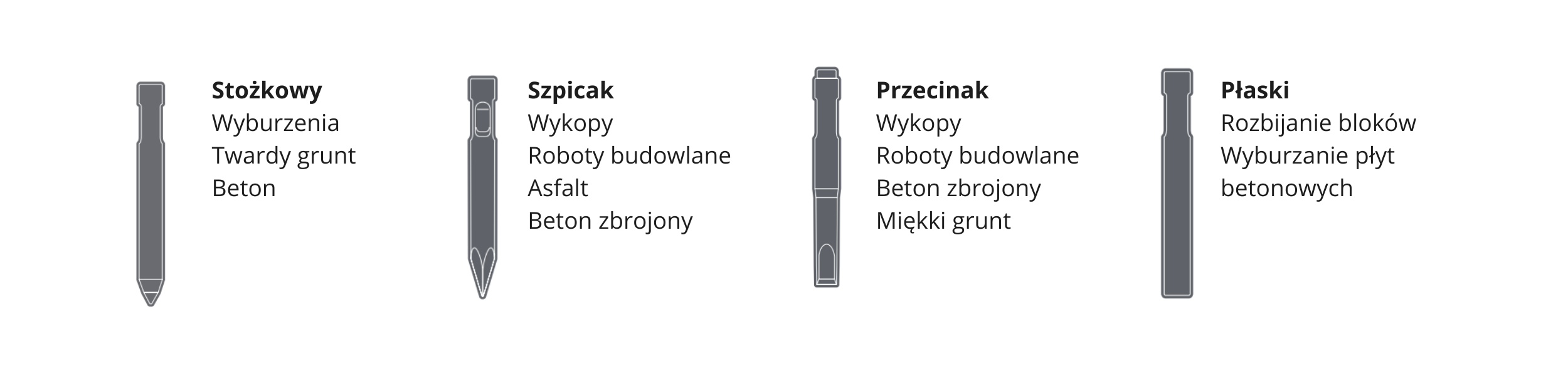 Zawsze używaj właściwego narzędzia pracy. Grot jest częścią zużywającą się, co stanowi główną przyczynę generowania dodatkowych kosztów. Ważne jest, aby wybrać odpowiednie narzędzie w zależności od charakteru pracy i charakterystyki rozbijanego materiału. Oryginalne narzędzia Develon są zaprojektowane tak, aby jak najlepiej pasowały do młotów Develon.